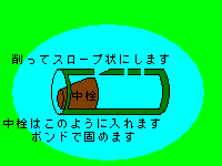 右図のようにします。音は入った空気が2つに 分かれることでなります。 音がなるまで最初は 苦労します。 中栓をいれ、中で動かし、 良い音が鳴るところを見つけ ボンドで固めます。