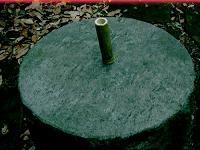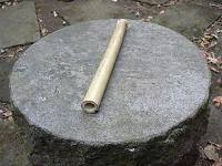 右図のような竹を切って右図の右にあるもののようにします。 これは笛の胴体となります。 この笛の体積が広ければ 広いほど低い音が出ます。 その逆も成り立ちます。 たけは物干し竿だったのを 使いました。