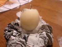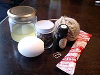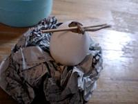 油を一度熱します。このときにクレヨンを削って 入れると色がつけられます。 今回はここでドライハーブを 入れました。 ここでは容器は卵の殻です がビンなどでもいいでしょう。 |