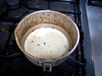 容器に油と凝固剤を流し込みます。凝固剤は少し多めに入れます。 中を少しかき混ぜたら、紐 の先端にクリップをつけ、 反対側の先端は竹ひごにく くりつけて、写真のような状態にします。 エッセンシャルオイルはこ こで入れます。