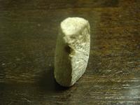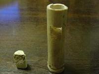 左図は木を小さく切ったものです。これが中栓となるわけです。 この中栓を彫刻刀でもっと小さ くし、やすりで削って形を整え 下の写真のようにします。 上のほうが下より細くなる ようにします。 |