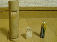 左図は笛本体と中栓と電池の大きさの比較です。 この次に中栓を竹にいれ、 調節します。 音がならない場合は スロープ状にした歌口に 問題があることが多いです。 |