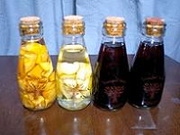 ←左から柿、山梨、山葡萄ですちなみに果実酒ではなく、醗酵 により国の許可なく酒を作る場 合は違法になるので気をつけて下さい。 熟成期間は(一番短くて)葡萄 系→約1ヶ月、柑橘類→1〜2 ヶ月、林檎系→3ヶ月。 |